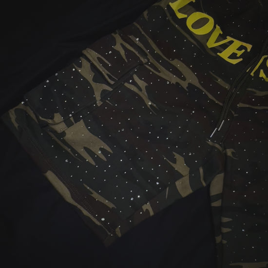 Unleash your inner rebel with our Camo Rhinestone set. A classic camouflage print gets a glam upgrade with sparkling rhinestones.The comfortable sweater and perfectly paired shorts create an effortlessly cool look that's ready for whatever the day brings. Stand out from the crowd and make a statement with our luxury streetwear brand.
